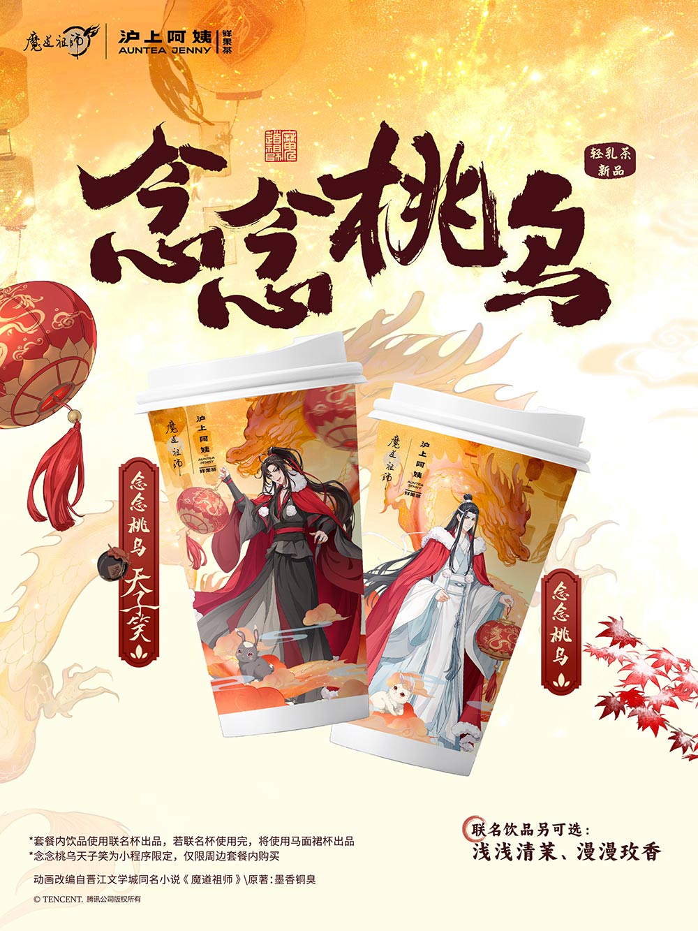 滬上阿姨與《魔道祖師》的聯(lián)名以輕乳茶為主要產(chǎn)品,取名為“念念桃烏”,“念念桃烏” 是一款不含酒精卻有白酒風(fēng)味的飲品,對(duì)應(yīng)聯(lián)名IP劇情中的“天子笑”元素。品牌準(zhǔn)備了設(shè)計(jì)精美的龍年主題聯(lián)名杯子,將魏無(wú)羨和藍(lán)忘機(jī)的形象印在了同一款聯(lián)名產(chǎn)品的AB面上,使其更貼合聯(lián)名主題。