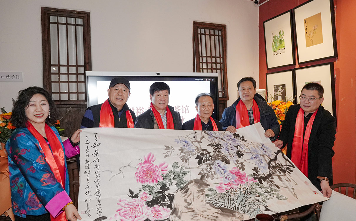 著名畫家、山東旅游書畫院副院長、秘書長郭執銓,副院長馬麟春專門為謝裕大濟南茶館創作一幅畫作《春和景明》,獻上祝福。