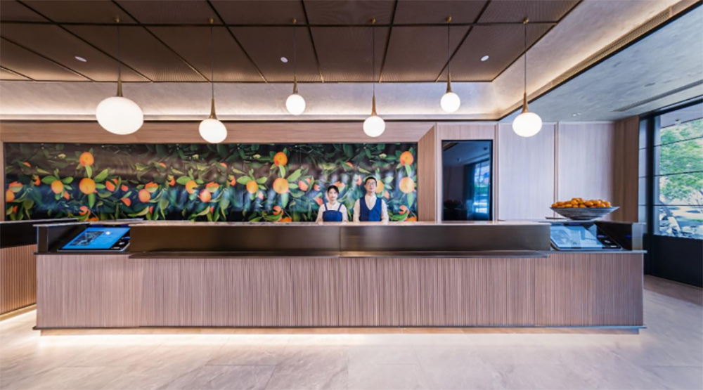 走進桔子濟南泉城廣場寬厚里酒店大堂,撲面而來的仿佛是加州橘子郡采擷而來的熱情與活力。大堂內新鮮甜香的桔子既能增香又可暢吃,感官營銷收獲住客諸多好評。墨綠色與桔色強烈反差,金屬包邊與木質格柵的材質搭配,包攬豐沛陽光的巨大落地窗,隨處可見的各類桔子背景墻、地毯、造型工藝品,這里是桔子的海洋,盡享桔氣的芬芳。大堂配有共享會議桌、美式沙發和茶點車以及Costa咖啡補給站,讓工作、社交、休閑流暢交融。30秒入住、0秒退房,把握時間節奏,為旅途尋求更多細節的幸福感。