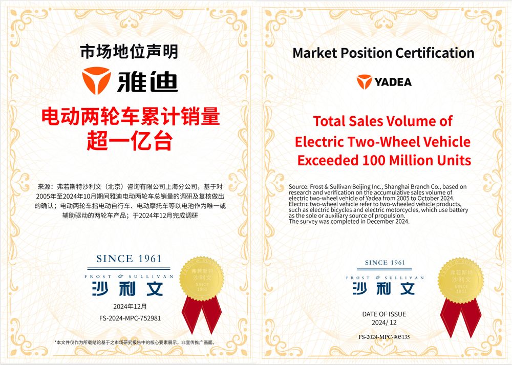 1億臺成就解鎖!雅迪霸榜電動車全球第一