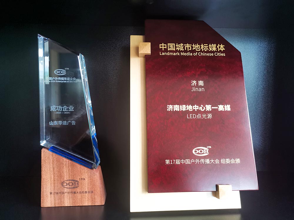 華途傳媒斬獲“中國戶外傳媒年度企業(yè)成功企業(yè)(2019-2020)”大獎,其旗下運(yùn)營的濟(jì)南綠地中心第一高媒榮獲“中國城市地標(biāo)媒體”獎。
