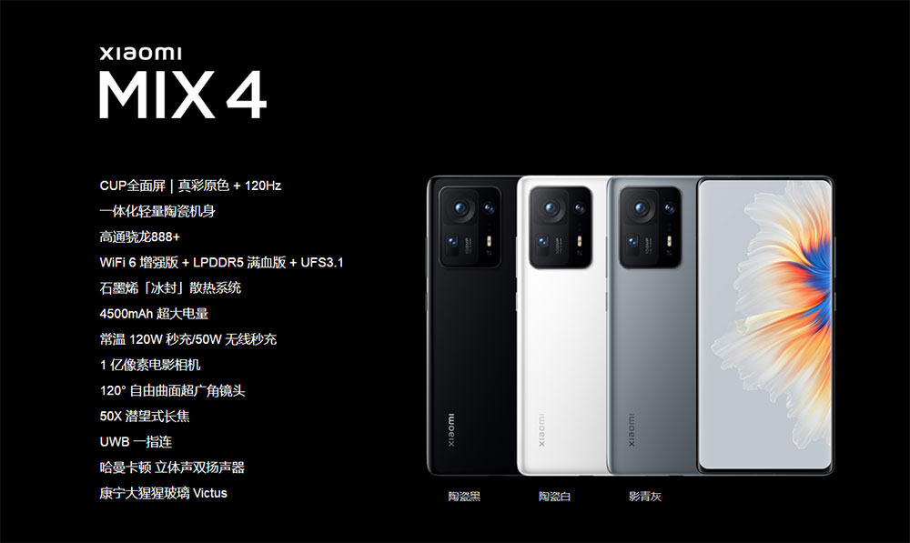 影像方面,小米MIX 4采用后置三攝模組,一億像素HMX主攝、1300萬像素的120度自由曲面超廣角以及800萬潛望長焦,支持5倍光學變焦,隨手一拍,都能拍出大師級別的影像照片。設計方面,新機厚度約8.02mm,重量約225g,共有影青灰,陶瓷白,陶瓷黑三種配色。此外,小米MIX 4首發輕量化一體精密陶瓷機身,支持未來連接方式UWB一指連技術,內置4500mAh雙串多極耳電池,配備小米最強充電系統120W有線快充及50W無線快充。