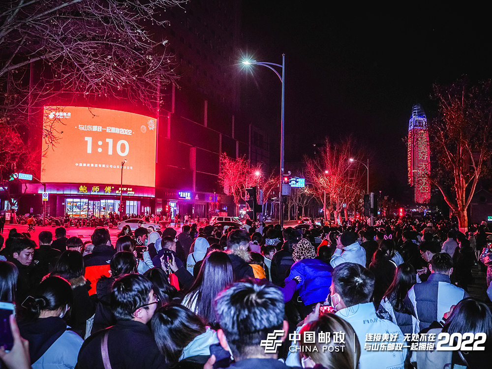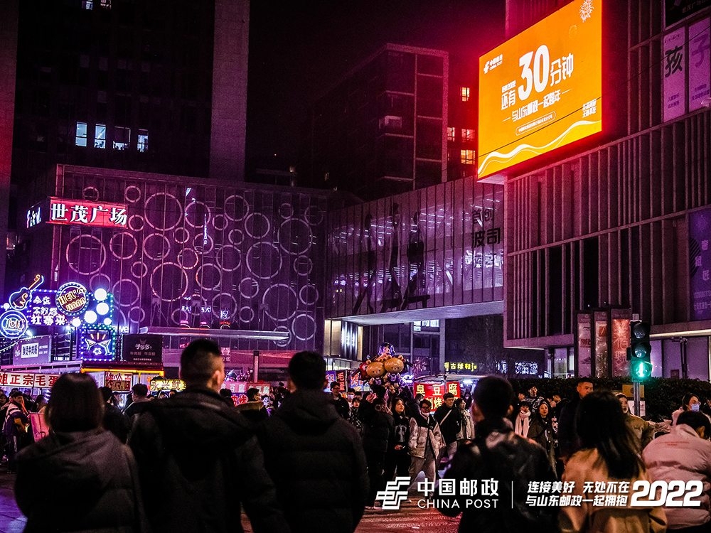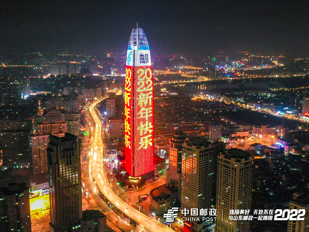 “2022,新年快樂!”“你好,2022!”“中國郵政 連接美好 無處不在”……拔地而起的高樓上,交替閃爍著今夜?jié)献罡叩腟logan。除了送出新年祝福,山東郵政也向多年來關(guān)心和支持郵政事業(yè)的廣大用戶“高調(diào)”致意,霓虹傳情。