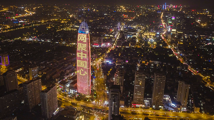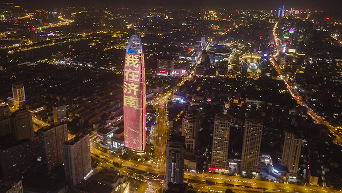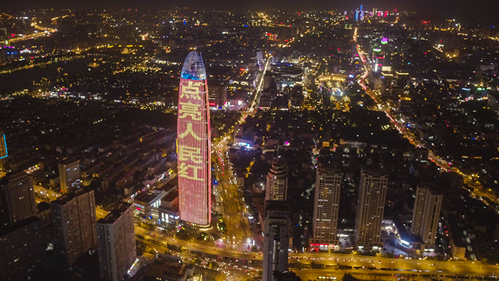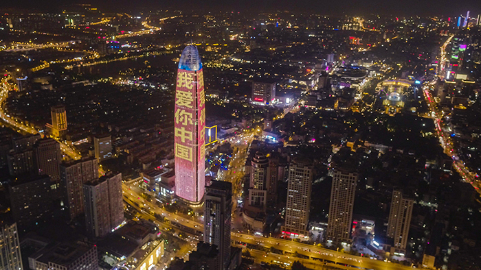 9月20日晚,人民網(wǎng)“向祖國(guó)表白”公益燈光秀在華途傳媒濟(jì)南市綠地中心地標(biāo)點(diǎn)亮。